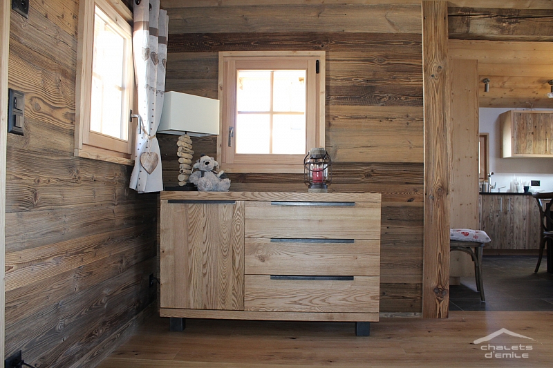 Ce chalet et entièrement construit en matériaux nobles et naturels, vieux bois, crépis minéral, pierre, fer, isolation en papier recyclé, et toit en tavillons.